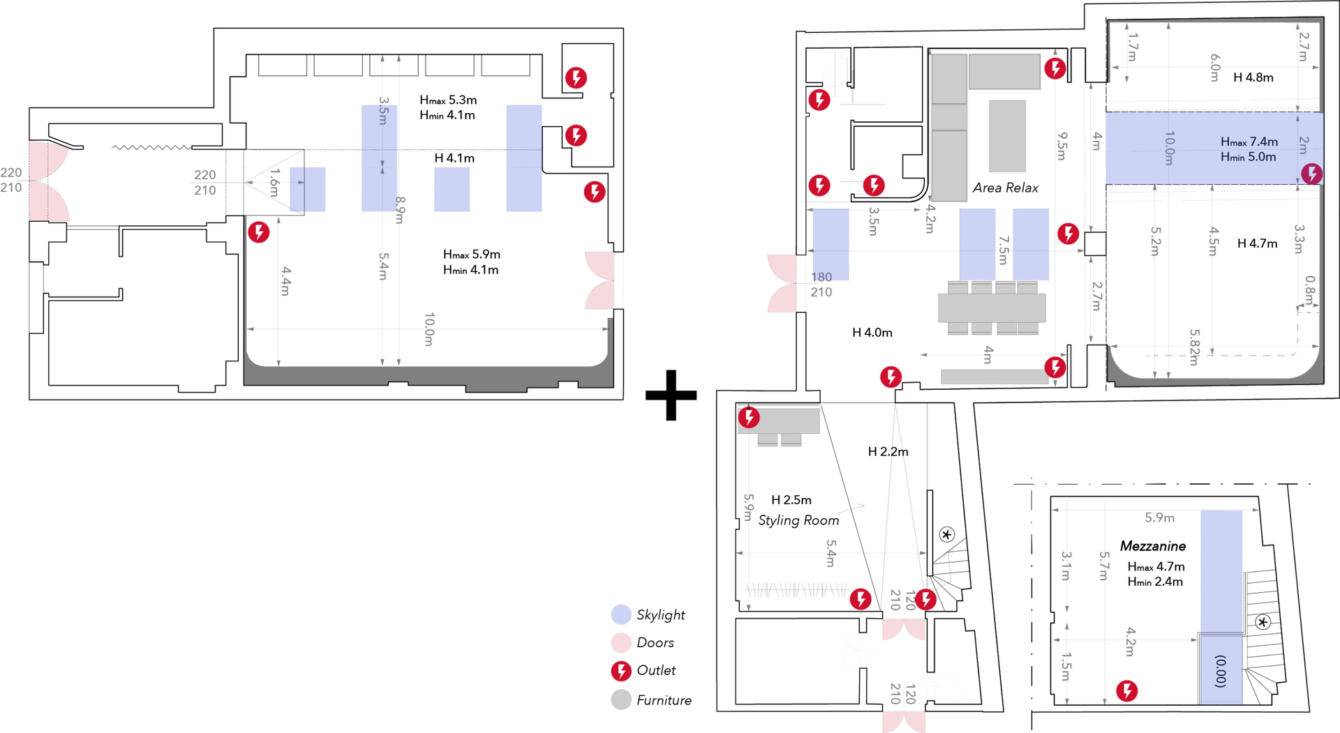 This studio is built on two levels: a pro- fessional photographic studio on the first floor with an elegant portrait room – perfect for fine art shoots – on the second floor. the studio allows to extend the space creating another area, reaching in total 278 sqm.